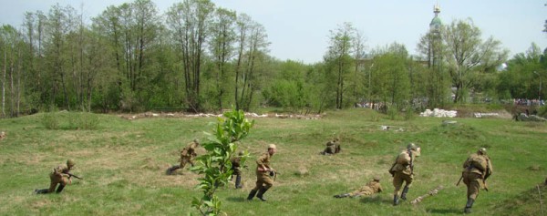 В сорокаминутную реконструкцию были включены фрагменты четырех лет войны. Сначала внезапное вторжение немцев в июне 41-го, окружение части наших войск, отступление Красной армии и неудачные атаки. Затем — ожидание подкрепления в 42-ом и наступление, каких было немало в 43-м и 44-ом. А в завершение — капитуляция гитлеровцев и победный разноцветный салют мая 45-го года.
